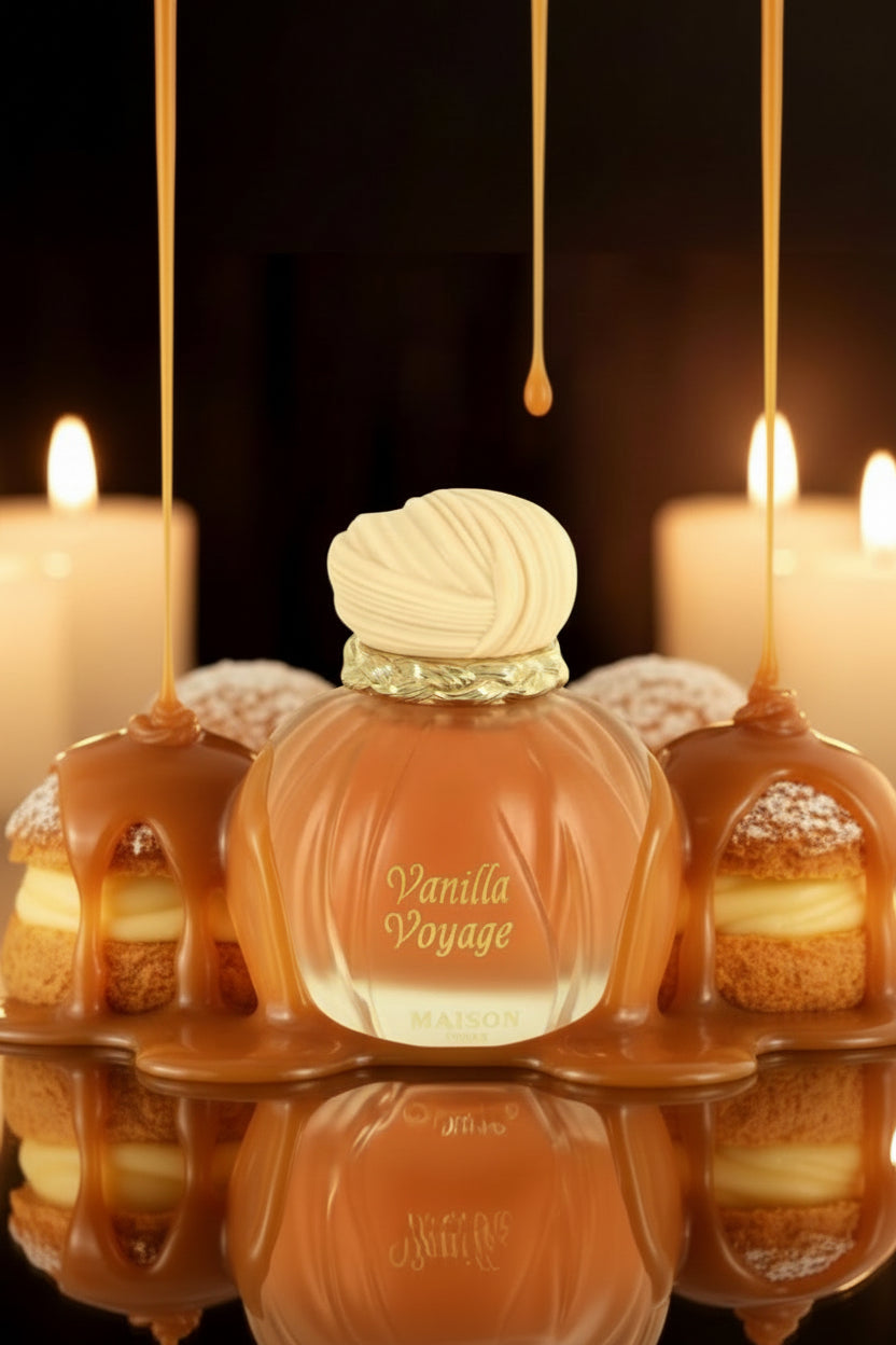 Vanilla Voyage de Maison Asrar est une fragrance gourmande et chaleureuse. Ses notes de tête de caramel et beurre s'harmonisent avec un cœur doux de fève de tonka, miel et jasmin. Le fond, riche en vanille, ambre et musc, offre une sensualité enveloppante et raffinée. Un voyage olfactif qui évoque douceur et confort.